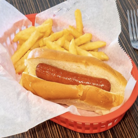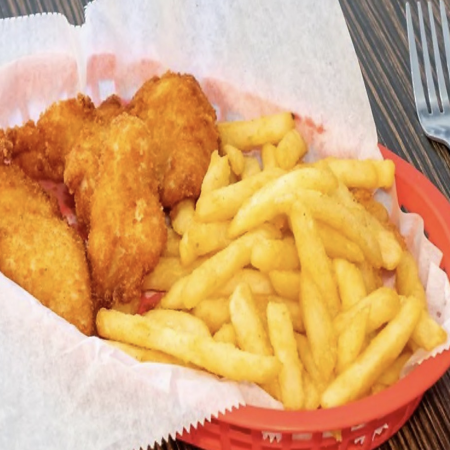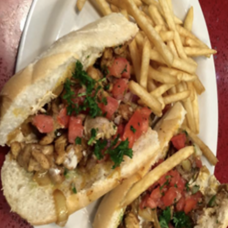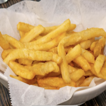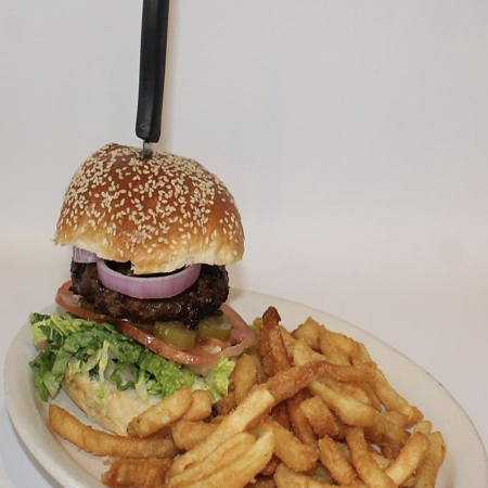 9 oz. Homemade burgers ground beef served on a sesame seed bun with lettuce, tomato, pickles, and red onions. Served with French fries.