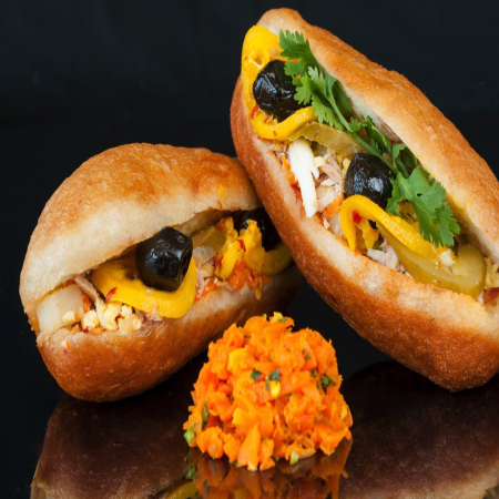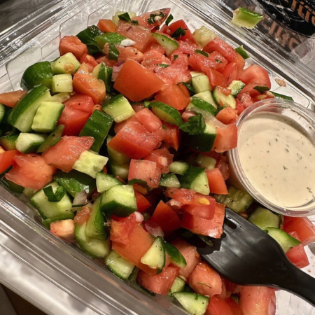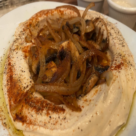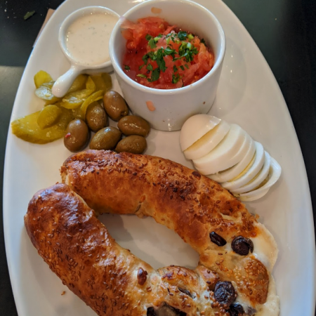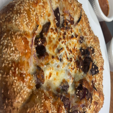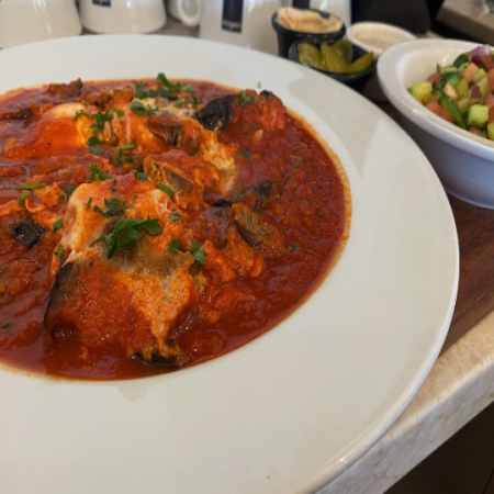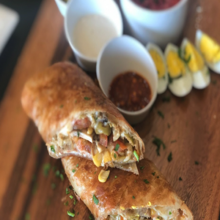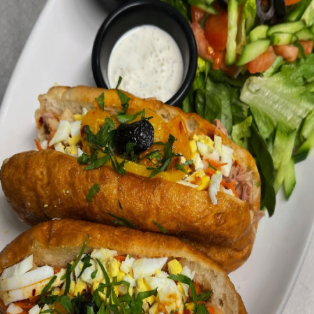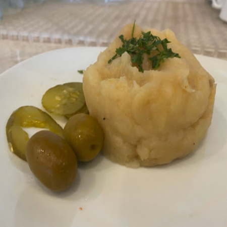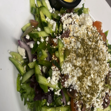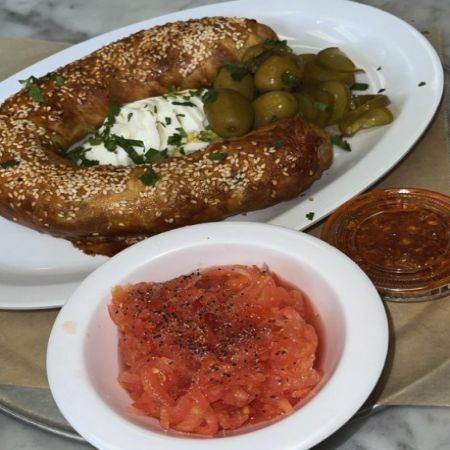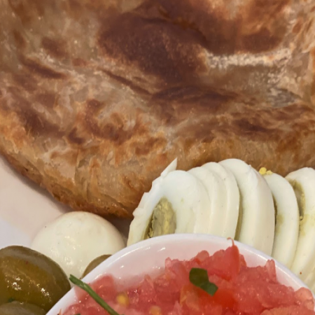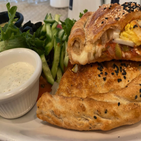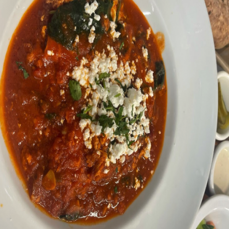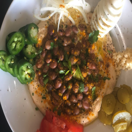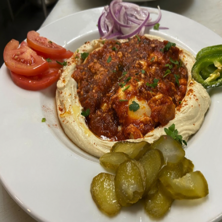 Served with pickles, sliced tomato, olives, and homemade hot sauce.