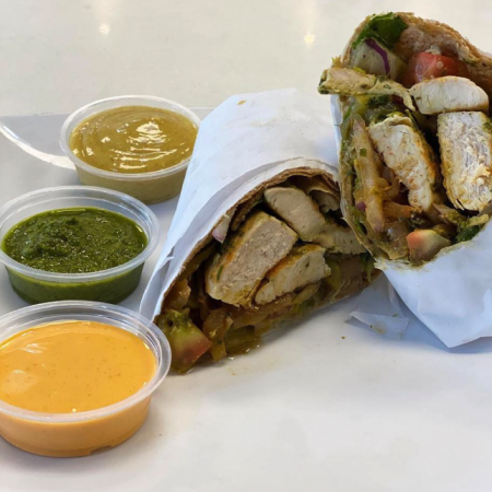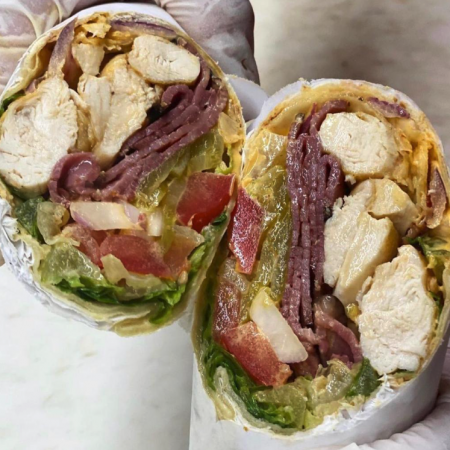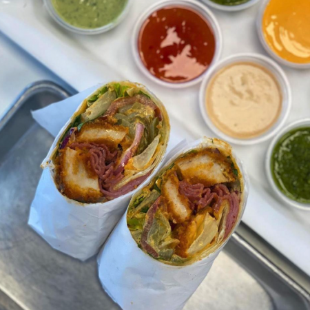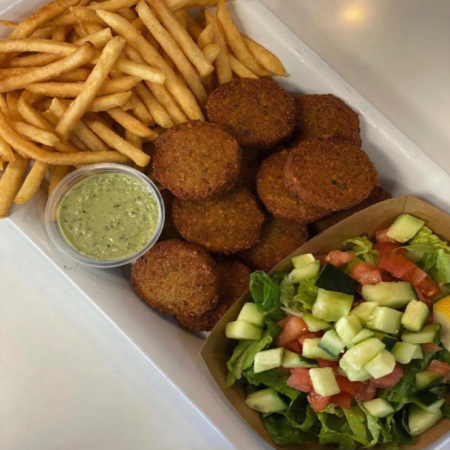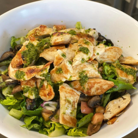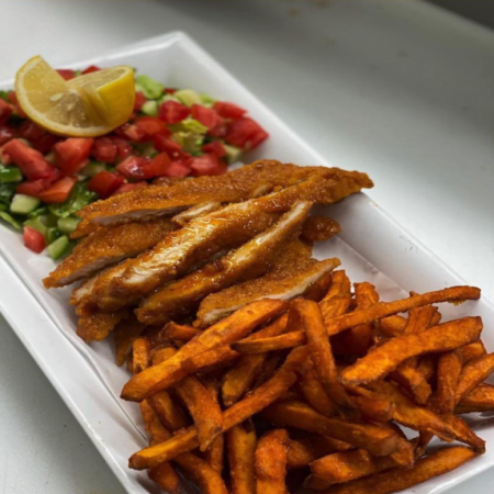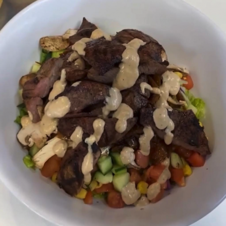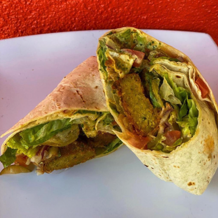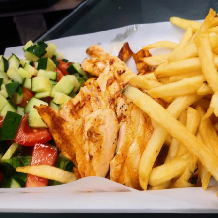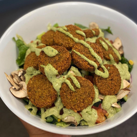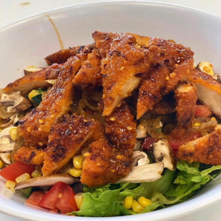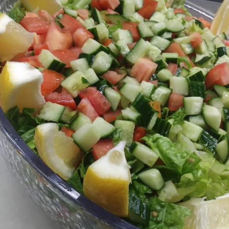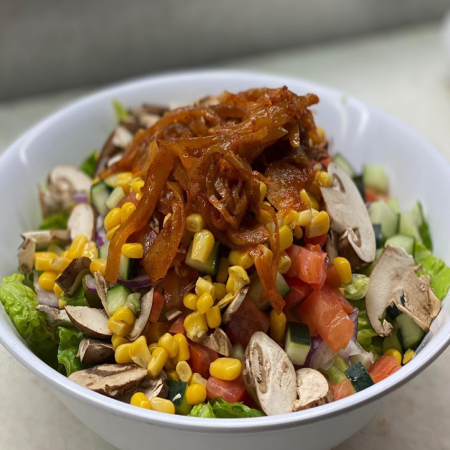 Comes with lettuce, tomatoes, pickles, onions, grilled onions, corn, mushroom, cucumber, red cabbage and green cabbage